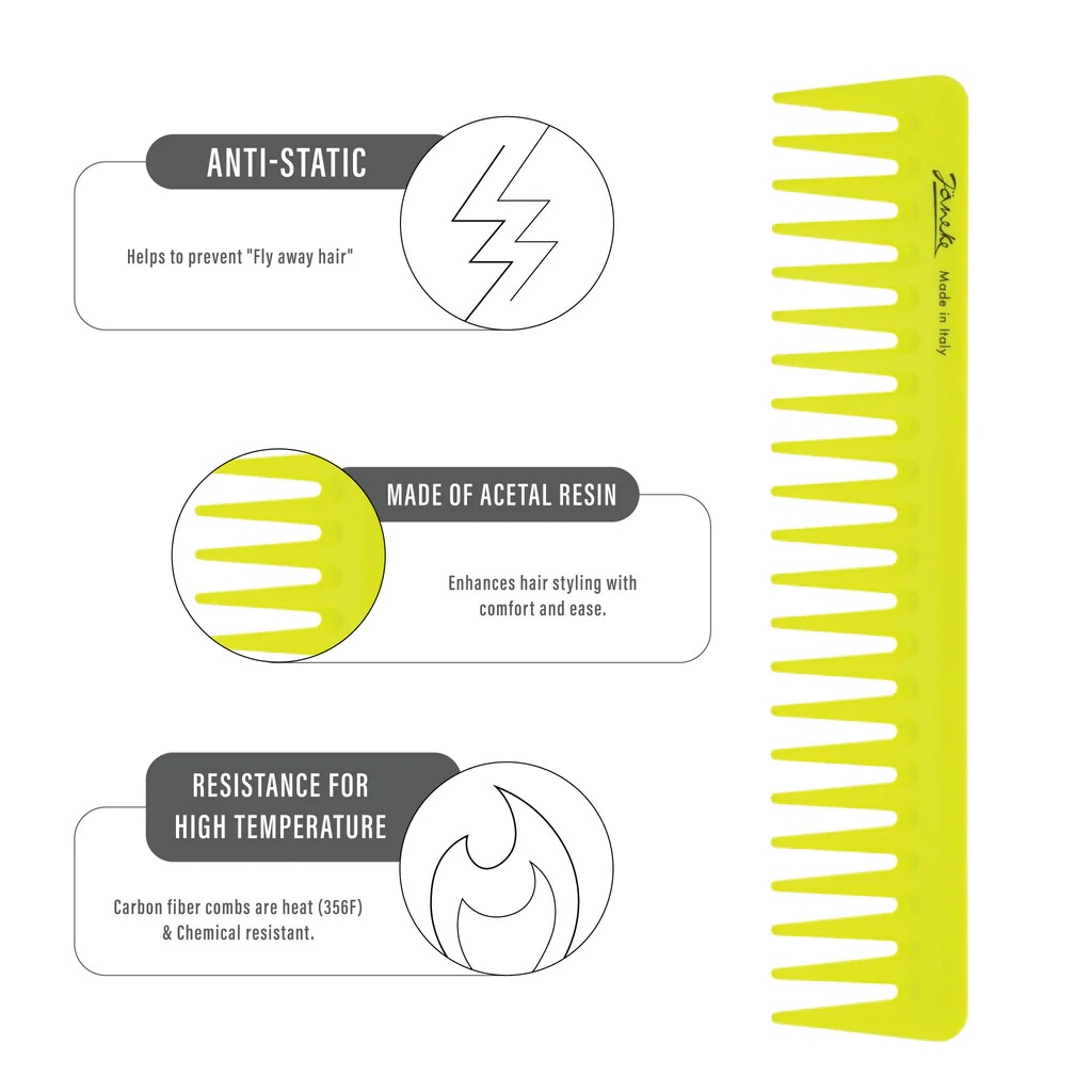 JANEKE SUPERCOMB for gel application with wide teeth, color yellow fluo. Colorful comb, perfect for an even application of various cosmetic products over the whole hair length. Resistant to high degrees and chemical agents. Causes no damage to the hair and, thanks to the rounded pins, is very gentle on the head skin.