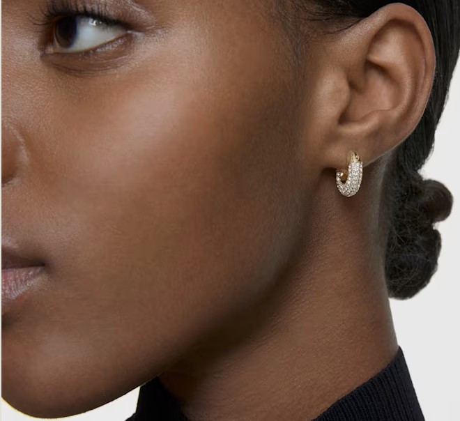 A modern spin on classic hoop earrings, this genderless pair will lend a dynamic touch to any outfit. Its sculptural design celebrates Swarovski's iconic Pavé technique with glittering foiled crystals set against a sleek gold-tone plated frame. Not just for daytime, wear this statement duo with after-dark looks, too. These earrings are part of the Dextera Family, designed for Collection III.